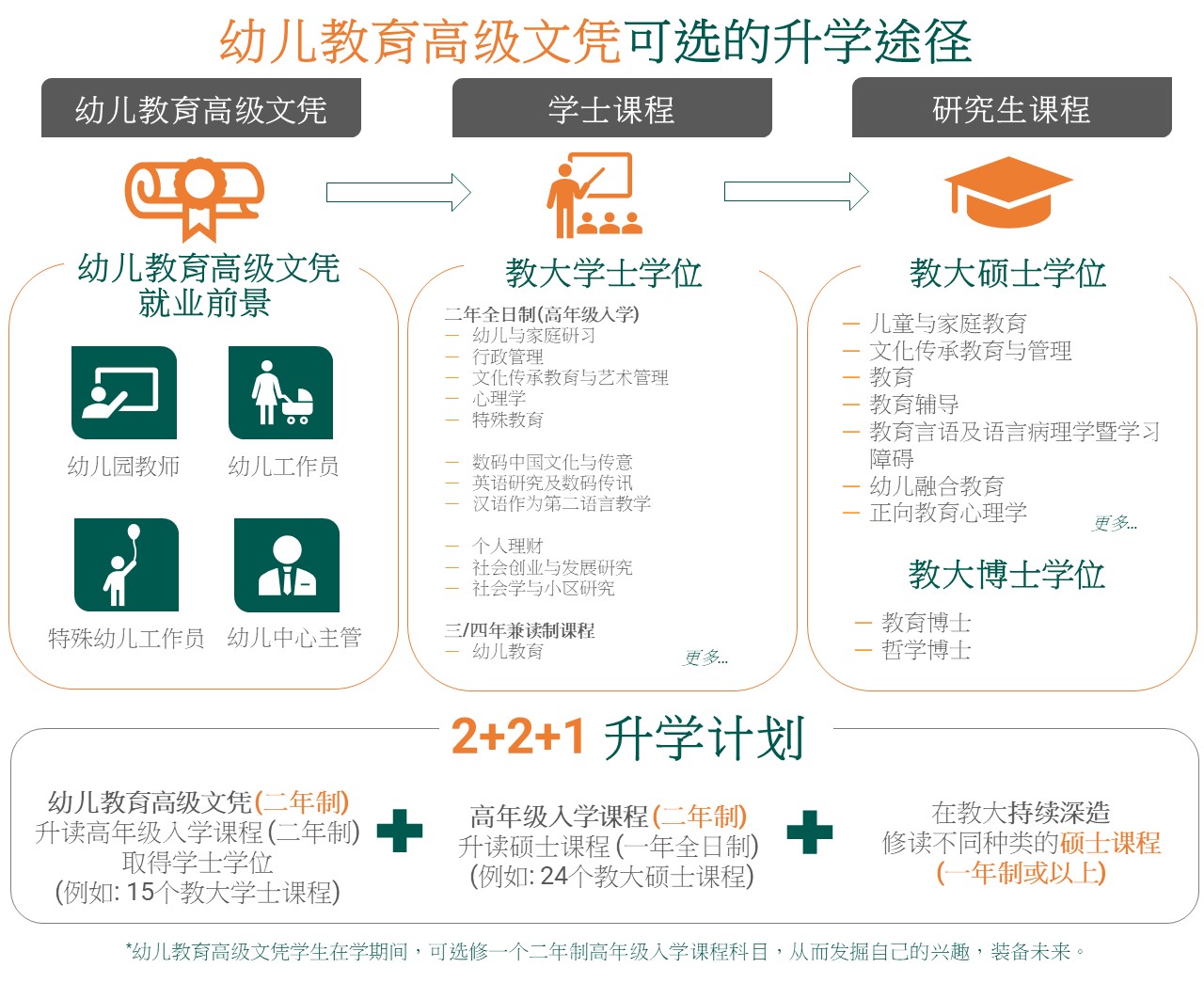 - 毕业生可申请註册成为合资格幼稚园教师和幼儿工作员,并具备担任幼儿中心主管的专业资格